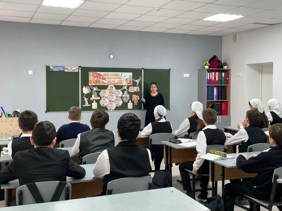 В начале урока Хамдиева Р.Х. отметила, что этот день в истории нашей страны символизирует героизм и стойкость советского народа, который, сражаясь за родину, доказала всему миру, что дух патриотизма и единства сильнее любого врага.